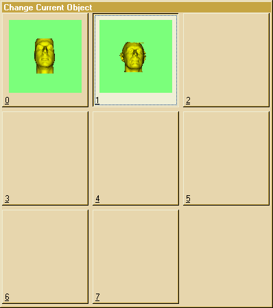 A total of eight objects (numbered 0 to 7) may be loaded from files or created by combining two existing objects (using the current+aux button). Multiple copies of the same file can be loaded. At any one time, two of these objects may be tagged as having special status (Current Obj & Aux Obj.).The Current object is the one, from the available set of objects, which is being examined or operated upon. The Aux object is the one used in operations involving a second object (registration, combination, surface difference mapping).