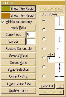 Press the right mouse button in the main window and drag to unselect a region of the image in the aux colour (this colour can be modified in the colour selection menu). Click and drag with the left mouse button to restore the normal colour. Once the regions are painted satisfactorily, two buttons in the edit menu (Show This Region) allow the choice of showing either coloured region. Apply Edits will irreversibly remove any unshown parts of the object.. If the edit pattern is saved after using Apply Edits then the pattern canot be loaded onto the original data - the edited data should also be saved to disk (as an obj or stl file) if subsequent re-use is intended.The Undo Last Show button reverses the effect of the last Show This Region click. The Restore Current Obj. button reverses the effect of all Show This Region clicks unless Apply Edits has been used which cannot be reversed. The Select All Surf button causes the whole object surface to be marked in the normal colour. The Select None button causes the whole object surface to be marked in the aux colour. The Swap selection button reverses the marking pattern.