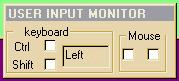 This shows the keyboard and mouse clicks that are occurring during the activity. Two boxes in the mouse section show left and right mouse clicks.Two boxes in the keyboard section show if the control or shift keys are pressed. The text window shows characters as they are pressed and displays the following codes: |