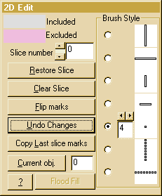 The slice number edit box displays, and allows selection of, the active slice. Slice 0 is at the top of the data set. Changing the active slice causes the state of the old slice to be updated in the 3D database before the new slice is displayed. The slices can be stepped up and down singly with the scrollbar arrows or a new slice number can be typed in the edit window (it is necessary to press the enter key after typing in the number). If the cursor is over the main 2D edit window, the up and down arrow keys may also be used to change slice.